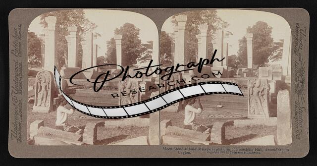 Moon stone at base of steps to platform of Preaching Hall, Anuradhapura, Ceylon