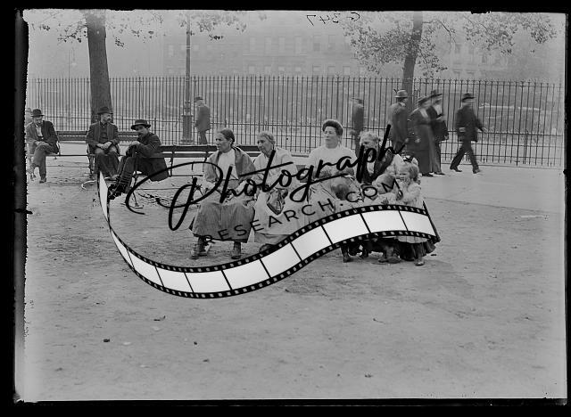 Four women,three children sitting,bench,park,Detroit Publishing Company,1900