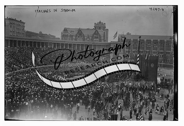 Italians marching into stadium,American flag,drummers,Bain News Service