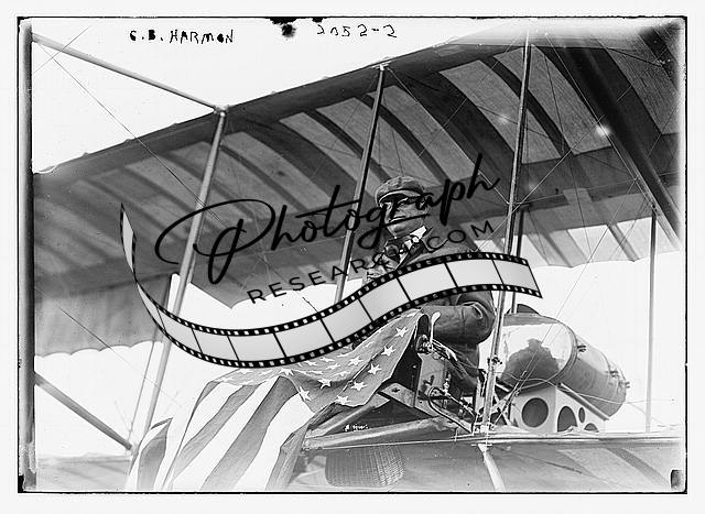 Clifford B. Harmon,1866-1945,aviator,air pilot,airplane holding US Flag,goggles
