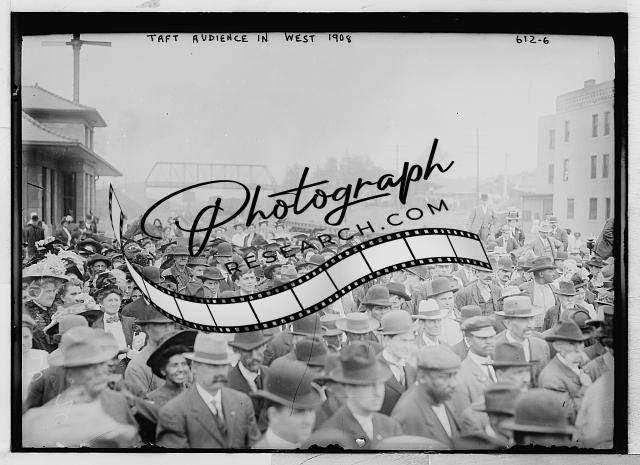 William Howard Taft crowd on railroad tracks in West,1908,RR tracks,US Flag