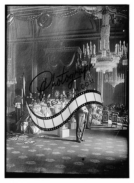 Body of King Edward,chandelier,men in uniform,gun,candle,death,Bain News Service