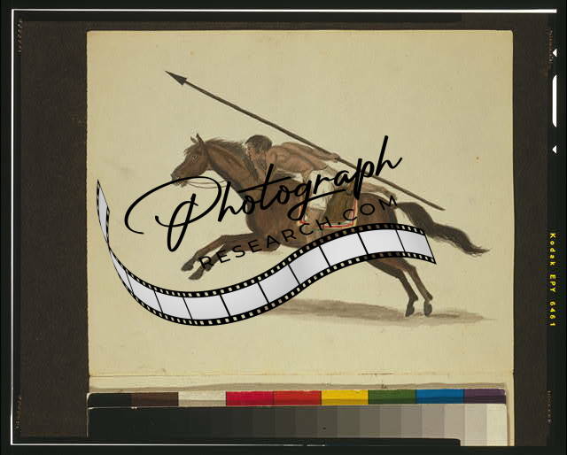 Warrior,possibly,Colombian,horseback,holding javelin,charge,riding,spear,c1850
