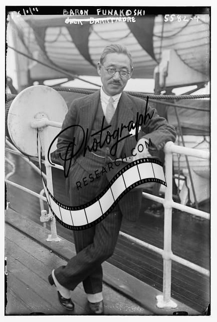 Baron Funakoshi,ship passengers,life boats,suits,glasses,hats,Bain News Service