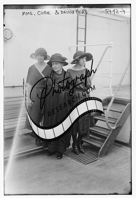 Madame Marie Curie,daughters,Irene,Eve,boat passengers,steps,hats,dresses,women