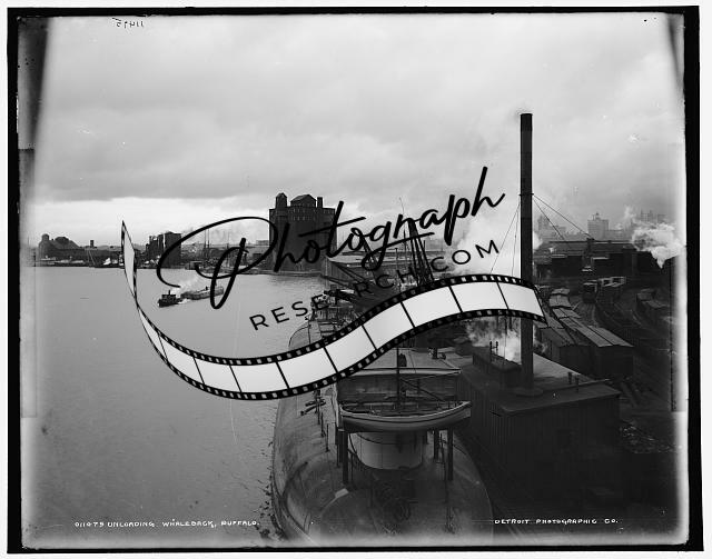 Unloading whaleback,piers,wharves,boats,shipping,vessels,Buffalo,New York,1890