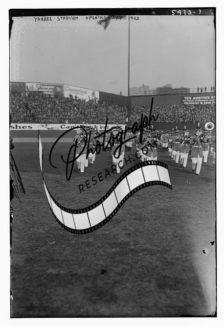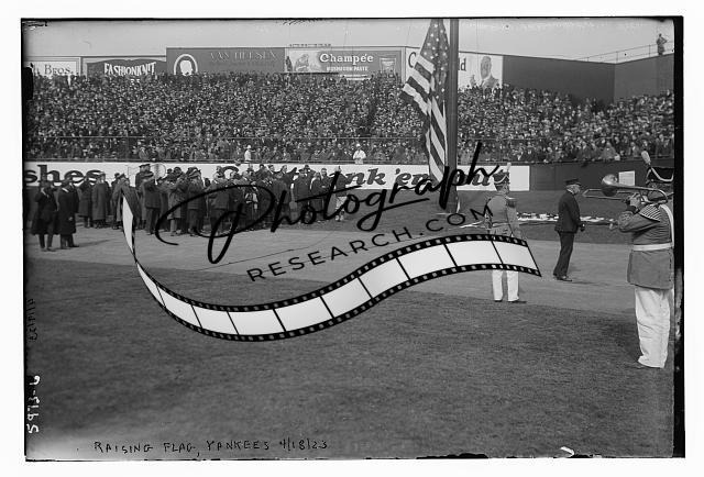 Original data provided by the Bain News Service on the negatives or caption cards: Ruppert, Landis, Huston, Frazee, Flynn, 4/19/23 [opening day Yankee Staduim]..
