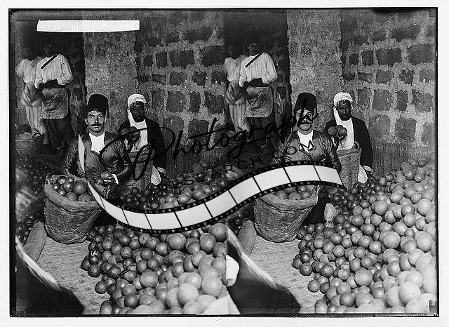 Title: Jaffa orange culture. Camels carrying boxes of oranges to the port