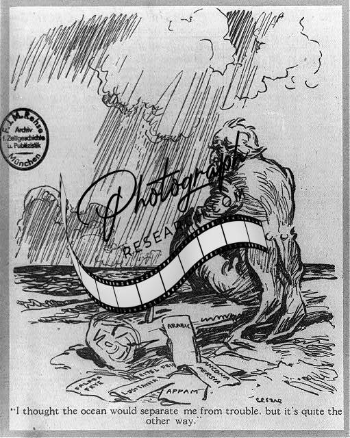 Uncle Sam sitting on beach,storm clouds,Cartoon,1916