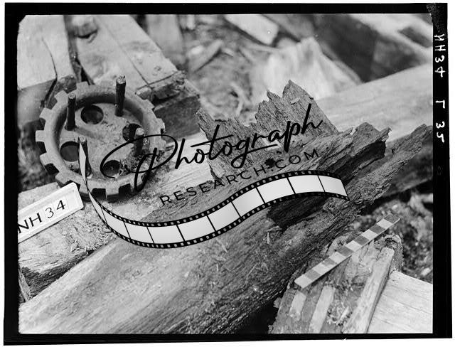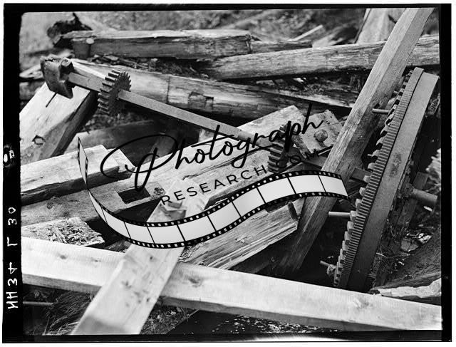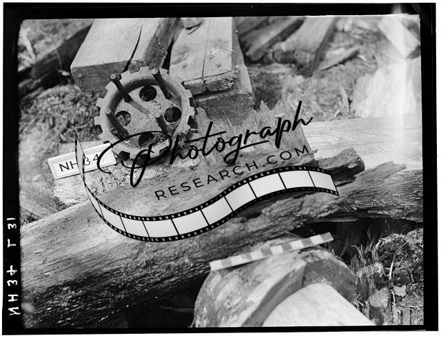 Title: 29. Historic American Buildings Survey J. C. Fletcher, Photographer RAG WHEEL, CARRIAGE GEARS & SHAFT FRAME MEMBERS. ONE WATER WHEEL IN POSITION FOUND - James Saw Mill, Narrows Brook, Northwood Narrows, Rockingham County, NH