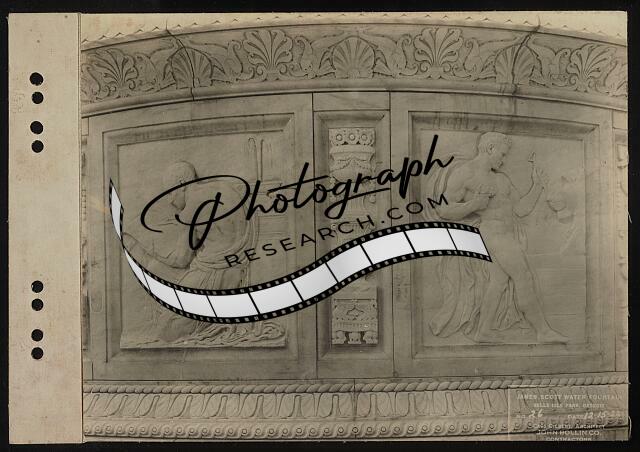 Summary: Record photograph shows construction of fountain designed by Cass Gilbert and built by contractors John Bollin Co., with detail of bas-relief sculptures by Herbert Adams.