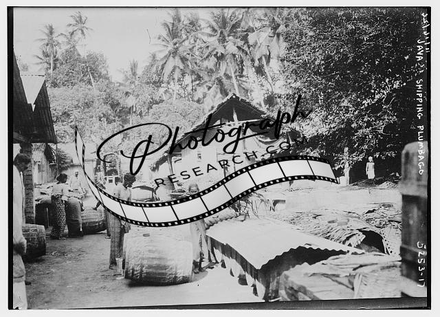Shipping Plumbago,barrels,storage,buildings,structures,palms,Java,Indonesia