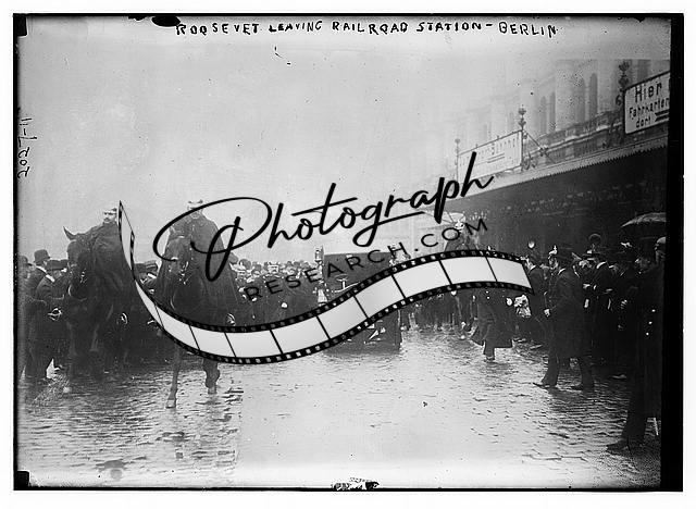 Theodore Roosevelt leaving railroad station Berlin. Crowd,car,men on horseback.