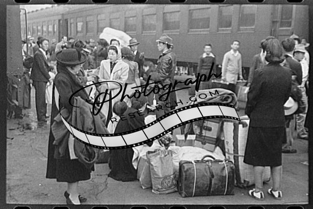 Title: Los Angeles, California. Japanese-American evacuation from West Coast areas under U.S. Army war emergency order. Waiting for the train to take them to Owens Valley