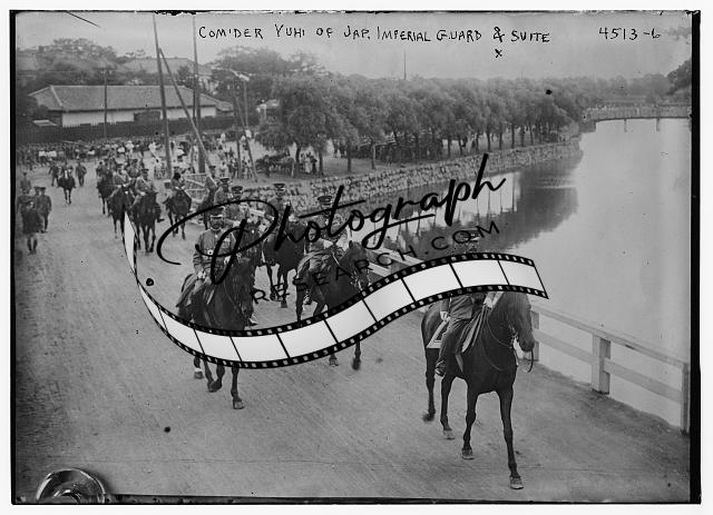 Commander Yuhi of Japan Imperial Guard & suite,men on horsback,bridge,Military