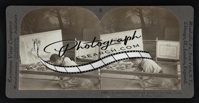 Embroidering painted designs on silk, close view, Kyoto, Japan