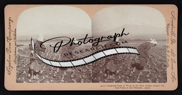 Japanese girls at work in the rice fields - grand old Fuji-Yama in the distance, Japan
