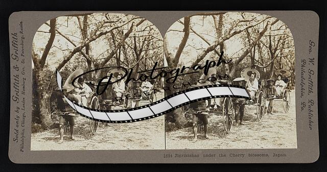 Jinrikishas under the cherry blossoms, Japan