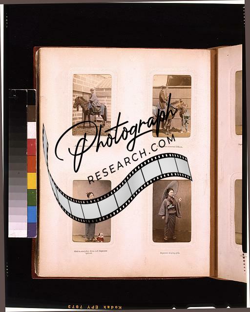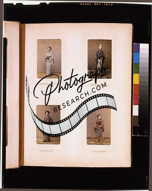 Captions on back of item: 'Ancient style of armour' (upper left); 'Japanese girls and mode of carrying umbrella' (upper right); 'Scavenger' (lower left); and 'My artists' (lower right).