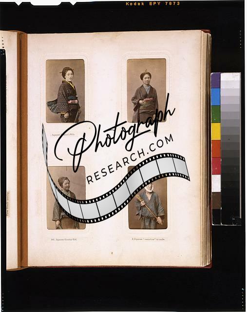 Captions on front of item: 'Native mode of dressing' (upper left); 'Japanese prince and staff' (upper right)'; 'A group of Japanese officers in court dress' (lower left); and 'Japanese Daimio and wife' (lower right).