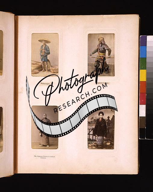 Captions on back of item: '45. Japanese girl in outdoor costume' (upper left); '80. Japanese officer of finance' (upper right); 'Japanese Lady's maid' (lower left); and 'Japanese country girl' (lower right).