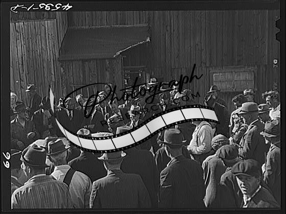 Title: Farmers reading auction notices of farms in the Pine Camp expansion area at an auction of the Ingalls farm near Antwerp, New York