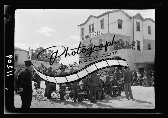 Title: Jericho entertainment by the Palestine Broadcasting Service. Gathering in the Jericho Square, showing Arab Legion Band in centre
