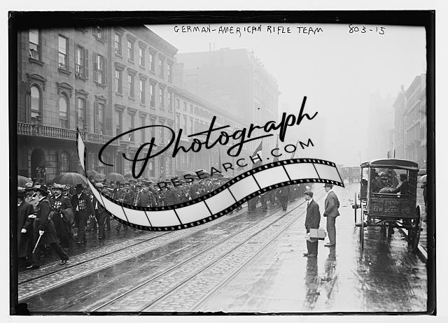 German-American Rifle Team,in parade,New York,NY,umbrellas,flags