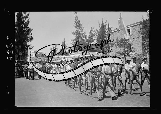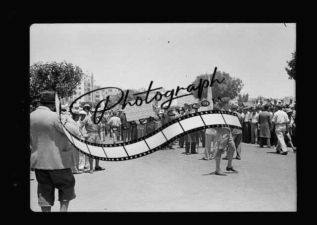 Title: Jewish protest demonstrations against Palestine White Paper, May 18, 1939. Zionist young men & girls parading on King George Ave. [Jerusalem]