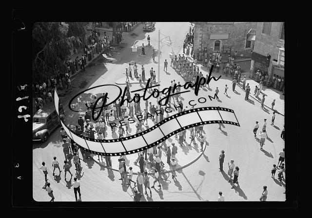 Title: Jewish protest demonstrations against Palestine White Paper, May 18, 1939. Crowded scene outside Edsen Cinema hearing an address by Mr. Ben-Zvi, heard through loud-speakers [Jerusalem]