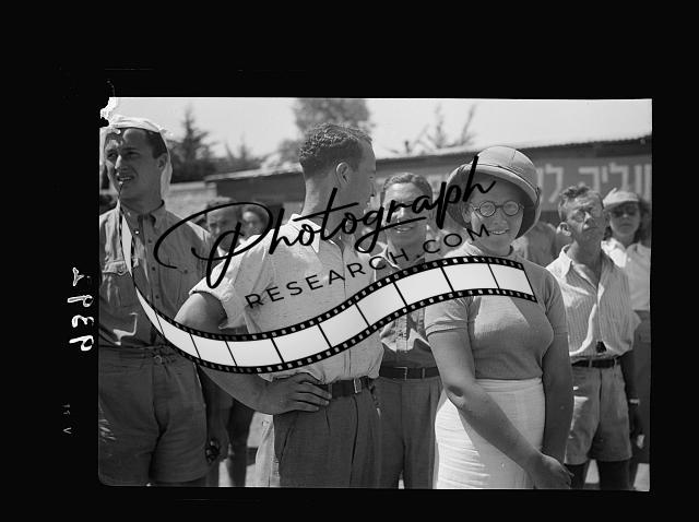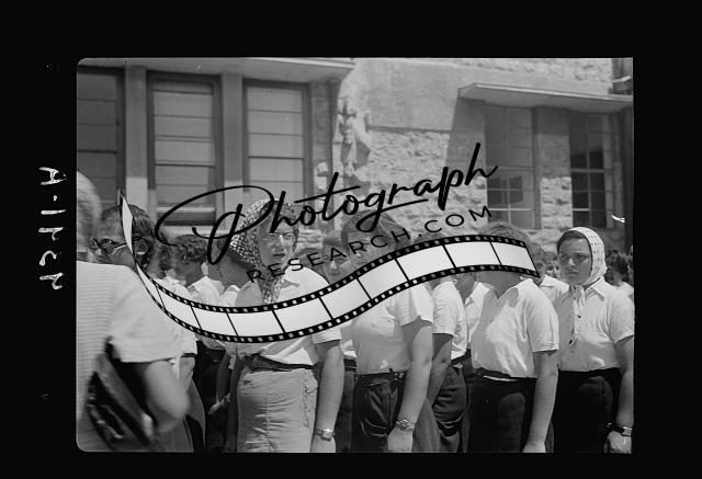 Title: Jewish protest demonstrations against Palestine White Paper, May 18. 1939. Types at the so-called recruiting station. The two girls on the right belong to the Rivisionists [i.e., Revisionists] or Brown Shirts [Jerusalem]