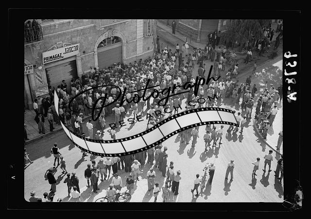 Title: Jewish protest demonstrations against Palestine White Paper, May 18, 1939. Crowded scene outside Edsen Cinema hearing an address by Mr. Ben-Zvi, heard through loud-speakers [Jerusalem]