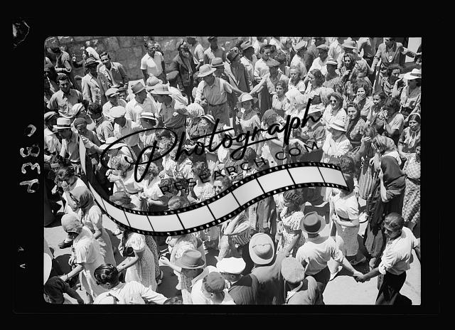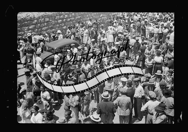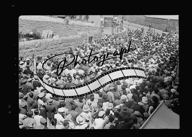 Title: Jewish protest demonstrations against Palestine White Paper, May 18. 1939. Crowded scene outside Edsen Cinema hearing an address by Mr. Ben-Zvi, heard through loud-speakers. Closer view of crowds [Jerusalem]