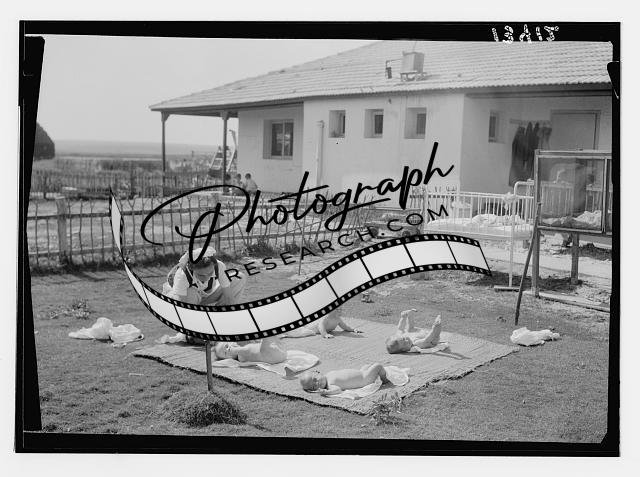 Title: Baby 'jews' enjoying sun and open air in their birthday suits with nurse in charge [Gat]