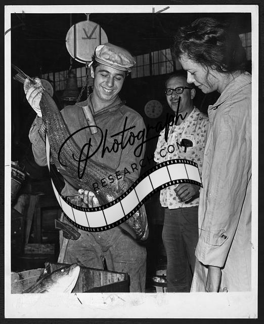 Sal Leggio showing a large stripped bass to Cindy Hughes at Fulton Fish Market
