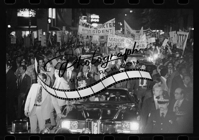 Jimmy Carter and Mayor Richard J. Daley ride in a torchlight parade during a campaign stop in Chicago, Illinois