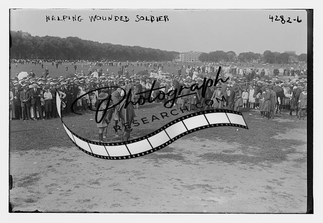 Helping wounded soldier,woman,horse,spectators,Bain News Service