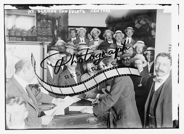 At German Consulate -- N.Y.,New York,men gathered,papers,Bain News Service
