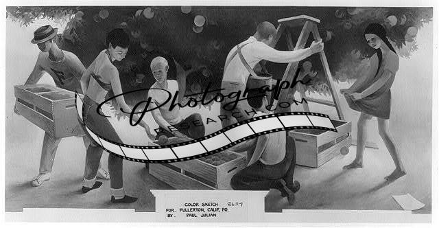 Photo of sketch,Fullerton,California,Post Office,1933-1941,harvesting fruits