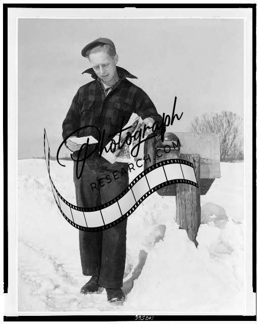 Paul Stone collects mail,Warren Butters' farm,boxes,snow,Exeter,Maine,MN,1947