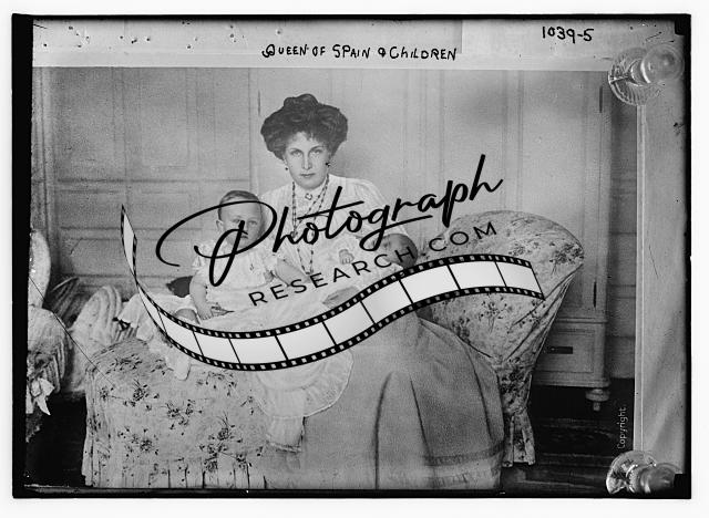 Queen of Spain on divan with her two children,baby,infant