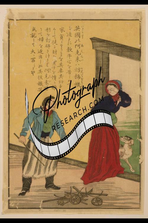 Summary: Japanese print showing Heathcoat displaying the first successful result from his knitting machine to his wife.