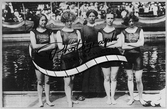 Champion Australian girl swimming team,4 girls in swimming suits,woman in middle