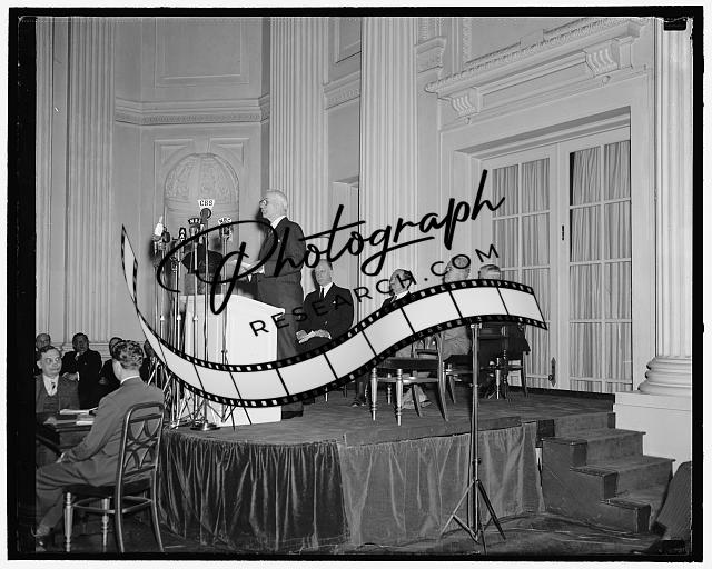 Cordell Hull at podium; Sumner Welles,others on platform,American Politicians