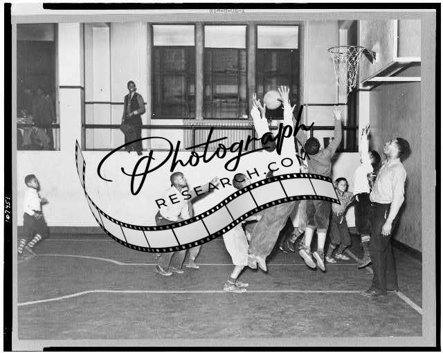 Group,African American children,basketball,gymnasium,Columbus School,NY,1937