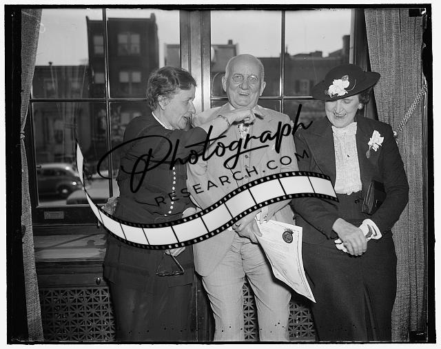 Title: Canadian named official of Dallas exposition. Washington, D.C., May 5. Vice President Garner today presented Capt. J.W. Flanagan, Texas millionaire and Canadian sportsman, with the Commission of Director General of Foreign participation for the Pan American exposition to be held at Dallas this summer. Capt. Flanagan will sail May 8 for Colombia where he will begin a tour of South America to interest Latin-American sportsmen in raising funds to bring Latin athletes to Dallas for the Inter-American Sports Show. In the photograph, left to right: Roy Miller, of Houston; Rep. Albert Thomas, of Texas; Capt. Flanagan; Rep. Sam Rayburn