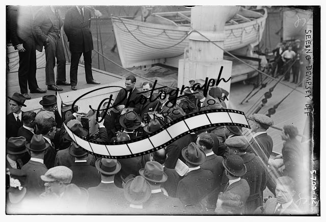 Seeing Dempsey off,ship passenger,lifeboats,crowds,rope,pulley,Bain News Service