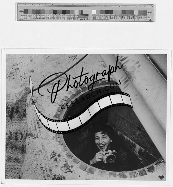 Photographer Charlotte Brooks smiling with her camera while inside manhole,1957