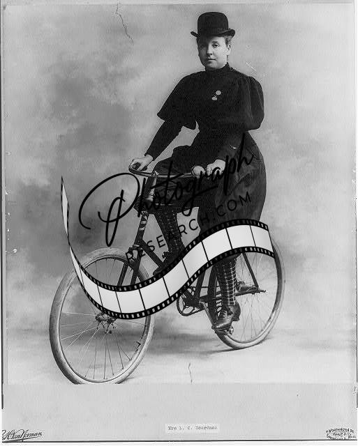 Mrs. L.C. Bordman,on bicycle,wearing derby hat,c1895