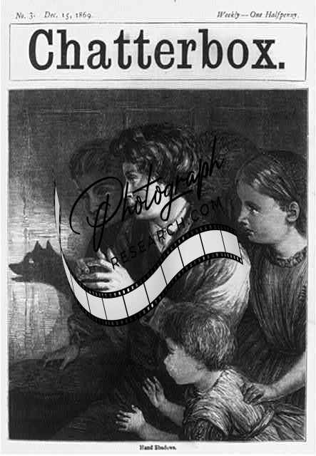 Hand shadows,children watching shadow of animal on wall,hands of woman,1869